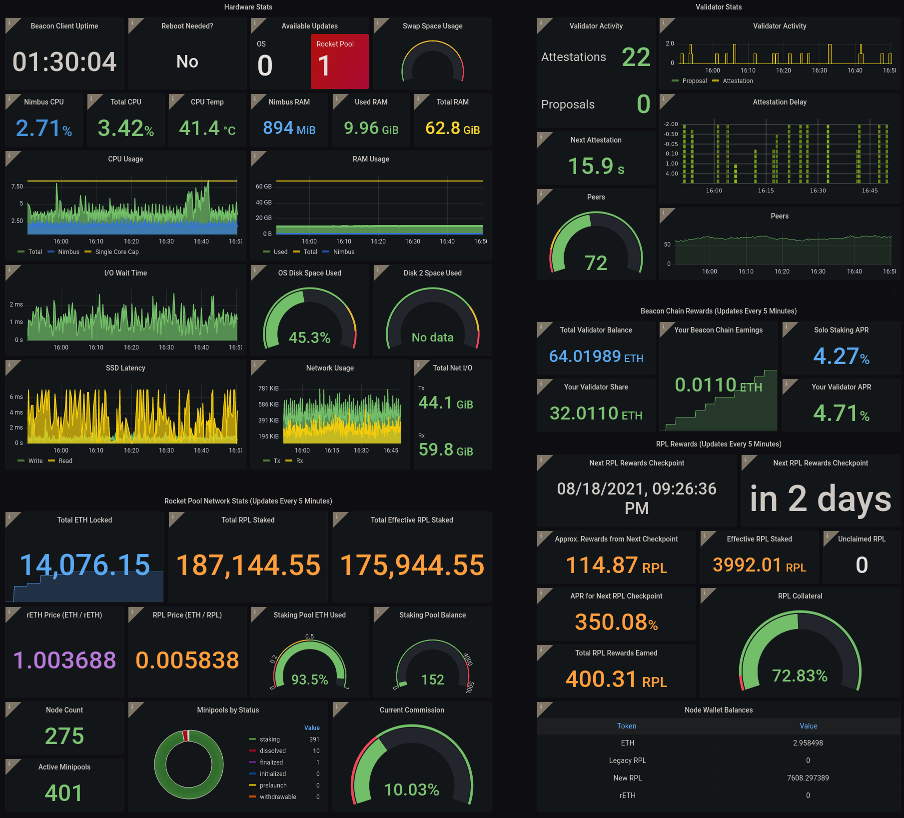 Rocket Pool comes with the ability to display a detailed dashboard showing metrics about your node's hardware health, system updates, your validator performance, your rewards, information about the overall Rocket Pool network, and more: