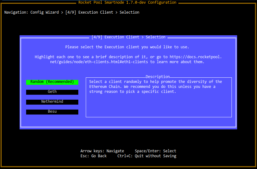 If you want the Smartnode to manage an Execution client for you, the next screen will ask you to pick a client: