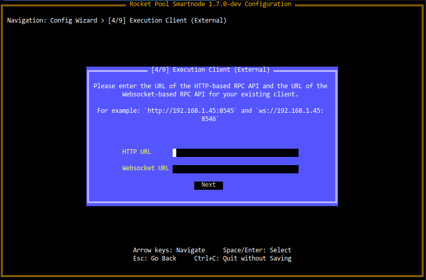 Because the Smartnode will run in its own Docker container, it will use Docker's internal network. You won't be able to use hostnames likelocalhost or 127.0.0.1 here; if your Execution client is running on the same machine as the Smartnode, you will need to provide the machine's LAN IP address instead.And with that, your Execution client is all set!