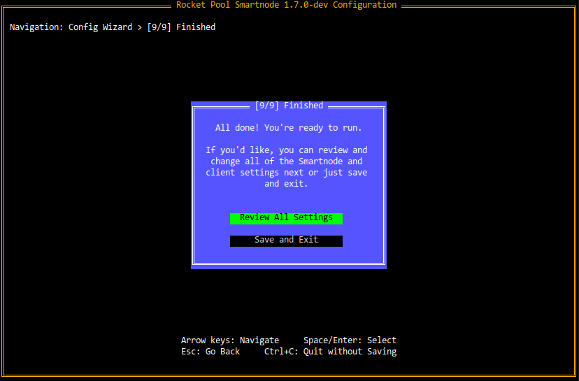 As a reminder, nothing will be saved to disk until you go through the Review dialog via the Review Changes and Save button. You are encouraged to explore all of the settings to learn about them and see what your Smartnode can do!
