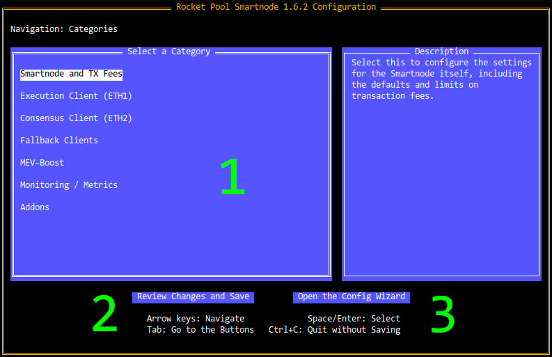 - The Category List, which lets you drill down into the settings for each category of the Smartnode stack