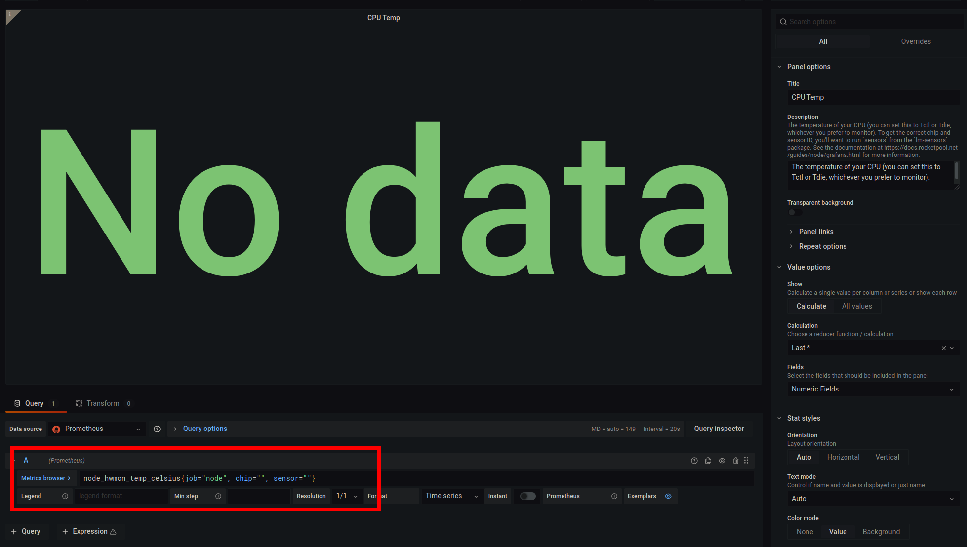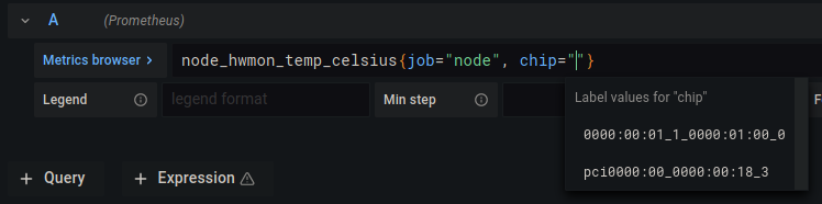 , sensor=""portion so it ends withchip=""}. For clarity, the whole thing should now benode_hwmon_temp_celsius{job="node", chip=""}. - Put your cursor in-between the quote marks of