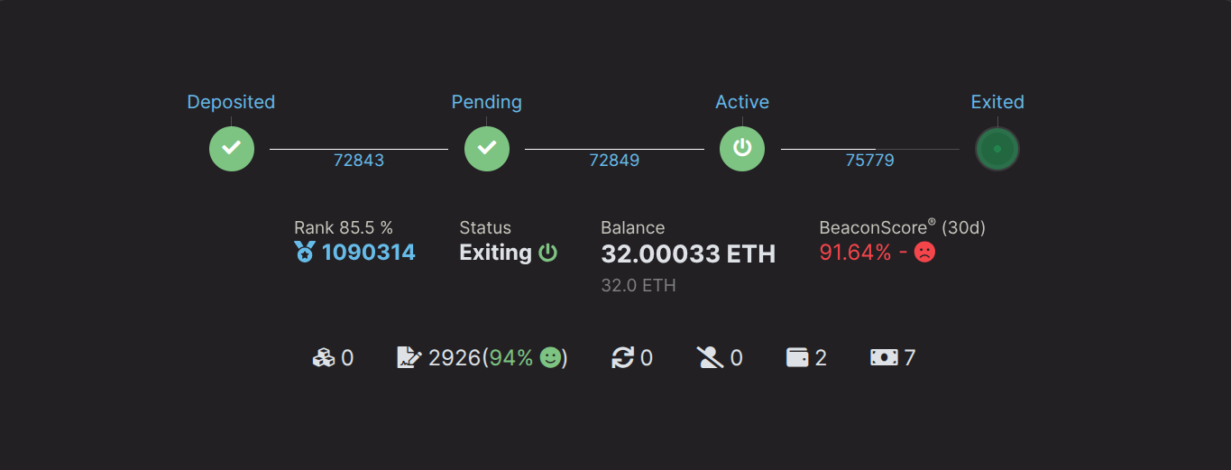 In the previous stage active_exiting, your node was making attestations while it was subject to the Beacon Chain exit queue. The time varies depending on