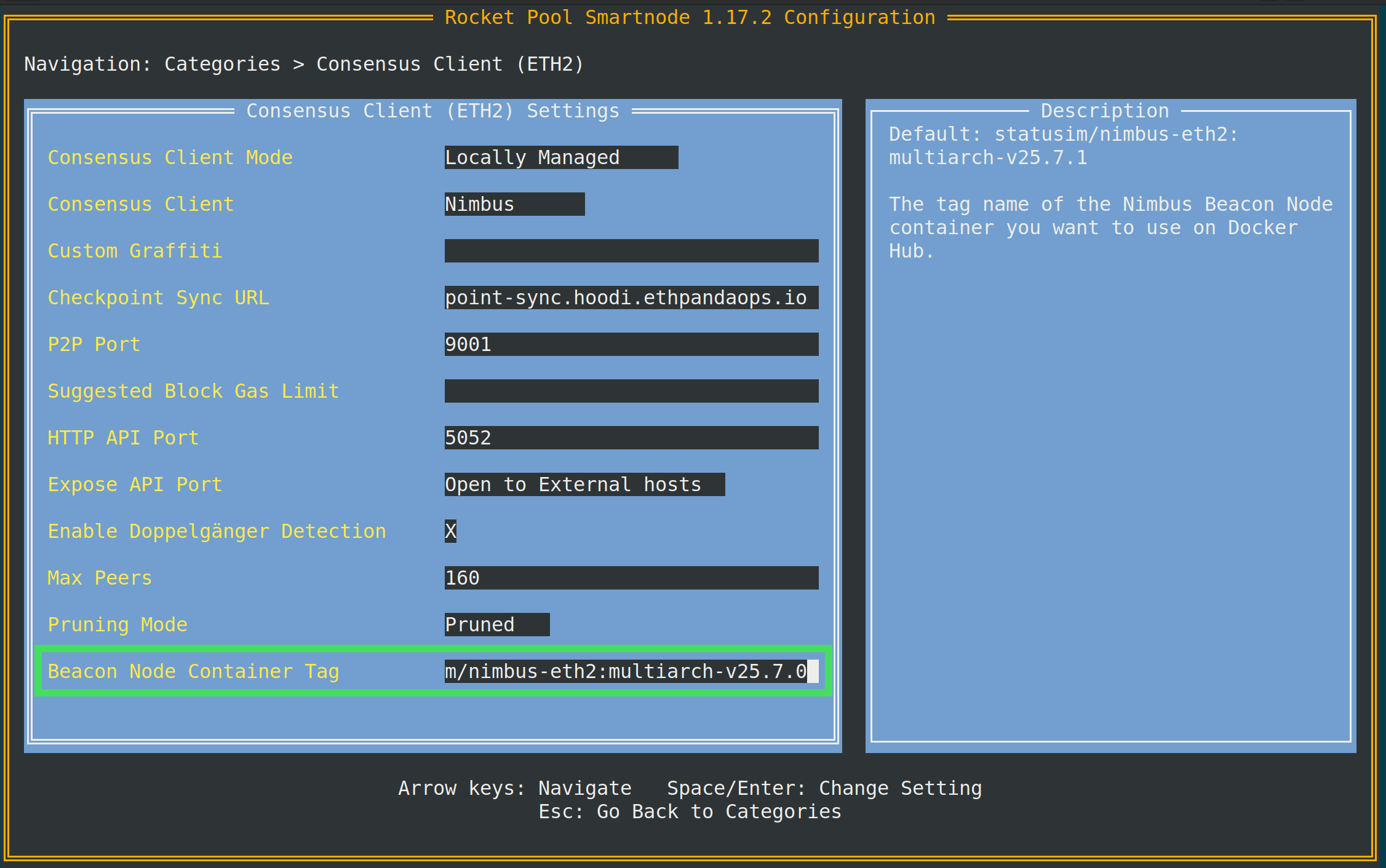 To change the Consensus client version, go to the Consensus Client category. Modify the Beacon Node Container Tag setting: