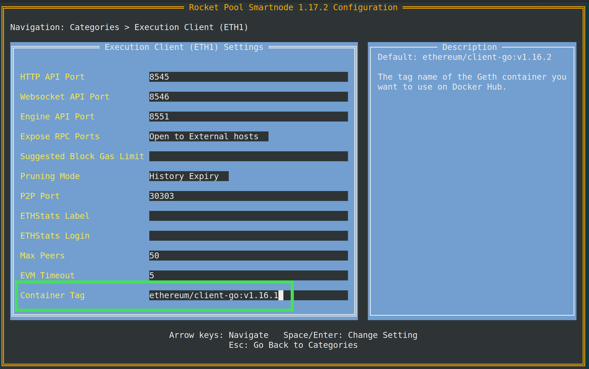 To change the Execution client version, go to the Execution Client category. Modify the Container Tag setting: