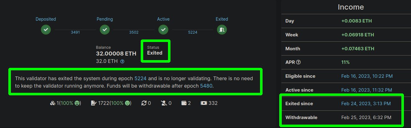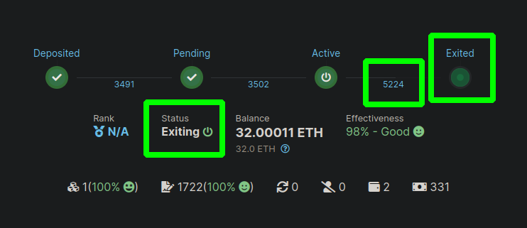 Here you can see the Status is Exiting, the epoch it will exit on is highlighted (5224), and the "Exited" icon will be pulsing green to indicate the operation is in progress.